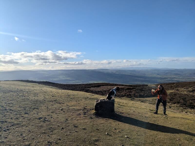 I thought I would share a little information about Moel Famau itself, the name means 'mother mountain' in Welsh, it is the highest summit in the Clywdian range- it is counted as a hill not a mountain (doesn't bode well for my Yr Wyddfa plan!). Moel Famau is 554 metres, 1818 feet high, and sits on the Offa's Dyke path. The area is covered in heather moorland, this is an important habit for rare species of bird. On Moel Famau, it helps to support the black Grouse, which was down to 10 males in the 1990's, and on more recent counts is up to 40 males- it is one of the rarest birds in Wales. It is reported, that if you go up very early in the morning, during Spring, you will see the males gathered around 'lekking' for female attention- it is supposed to be quite a sight. The heather feeds and supports so many species of animal and is protected. You will see rectangular patches where it has been burnt or cut, they do this to encourage new growth and to allow sheep to graze. As with a lot of these places, Moel Famau is a site where farmers have 'the right to graze', so there will often be sheep there at all times of the year, so dogs are asked to be kept on lead. Flora did complain about this, which in turn, led the husband to end up being yanked about on several occasions, as her lead manners are poor- she is a wild spaniel you see.